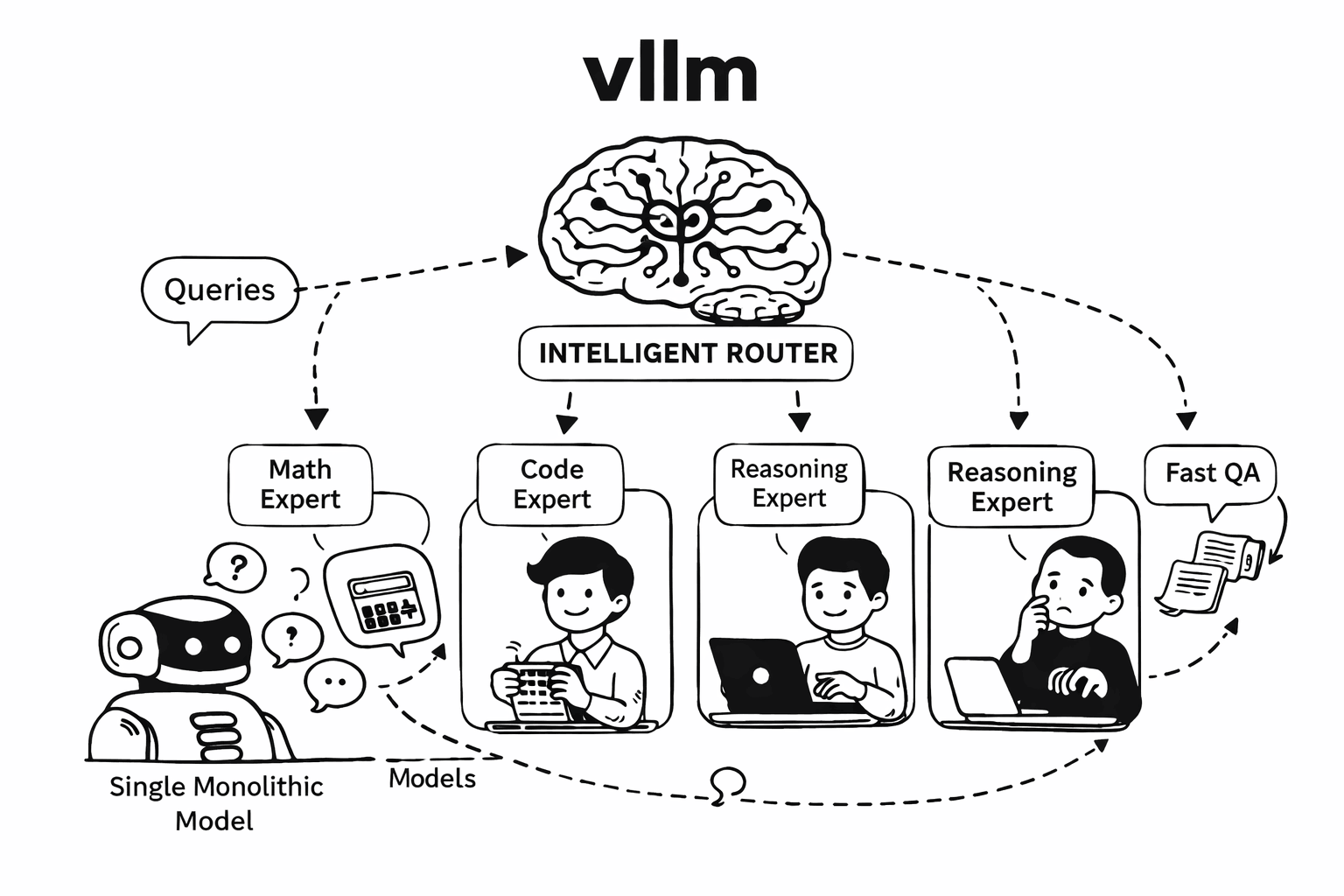 1. Cost inefficiency: A 405B model processing “What’s 2+2?” wastes 99% of its capacity